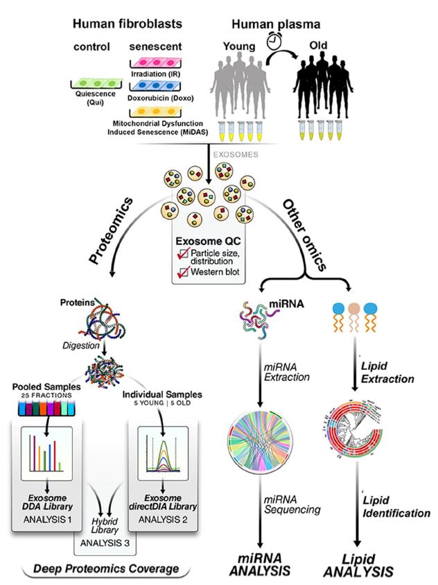 該研究題為《自衰老細胞釋放之外泌體及人體血漿中循環外泌體所揭示其與老化相關的蛋白質體與脂質體的特徵》, 由美國巴克老化研究所(Buck Institute for Research on Aging)的科學家們主導。為了全面解析老化過程, 研究團隊設計了一套嚴謹的多體學(Multi-omics)研究流程並從多個維度探索外泌體的秘密。